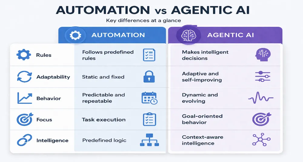 Automation: Rule-based task execution | Agentic AI: Goal-driven autonomous systems