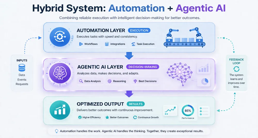 The real opportunity isn’t choosing between automation and agentic AI, but combining both. Systems that automate execution while using AI for decision-making tend to perform better and scale more efficiently.